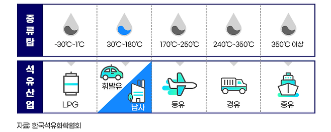 정유산업은 이런 과정을 통해 LPG, 휘발유, 경유 등의 연료와 석유화학의 기초가 되는 납사(Naphtha, 나프타)를 만듭니다. 국내 정유산업은 SK이노베이션, GS칼텍스, 에쓰오일, 현대오일뱅크 등 4대 정유회사가 이끌고 있습니다.
