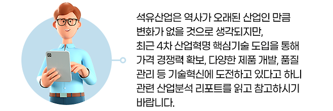 국내 석유산업 관련 기업들도 그동안 축적된 기술적 노하우에 에너지 절감, 환경 오염 저감, 폐플라스틱 열분해유 기술 개발 등에 적극적인 투자를 하며 새로운 성장 동력을 찾고 있습니다.