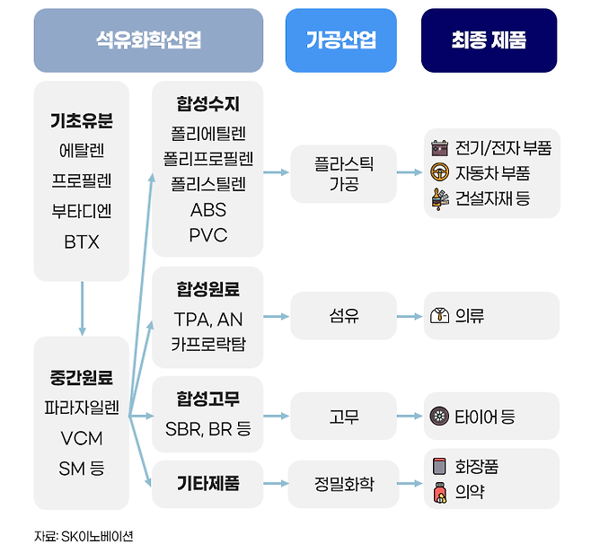 정유업의 전방산업인 석유화학회사는 원유를 분해해 나오는 납사 또는 천연가스를 사용하여 실생활에 쓰이는 화학제품들을 생산합니다. 플라스틱(합성수지), 합성고무, 합성섬유 등이 대표적인 석유화학 제품입니다.