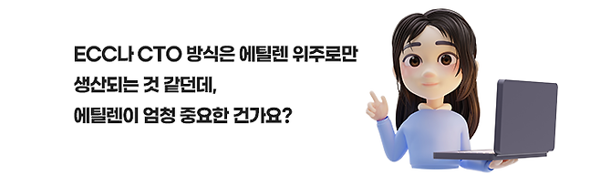 ECC는 에탄가스를 원재료로 하며 천연가스가 많이 나오는 중동과 미국 등에서 많이 사용됩니다. 특히 미국이 셰일가스를 본격적으로 생산하면서 천연가스 가격이 하락했었던 2010년대에 많이 사용된 방식입니다. 생산제품 중 에틸렌의 비중이 높고, 다른 제품을 생산하기에 제약이 많습니다.