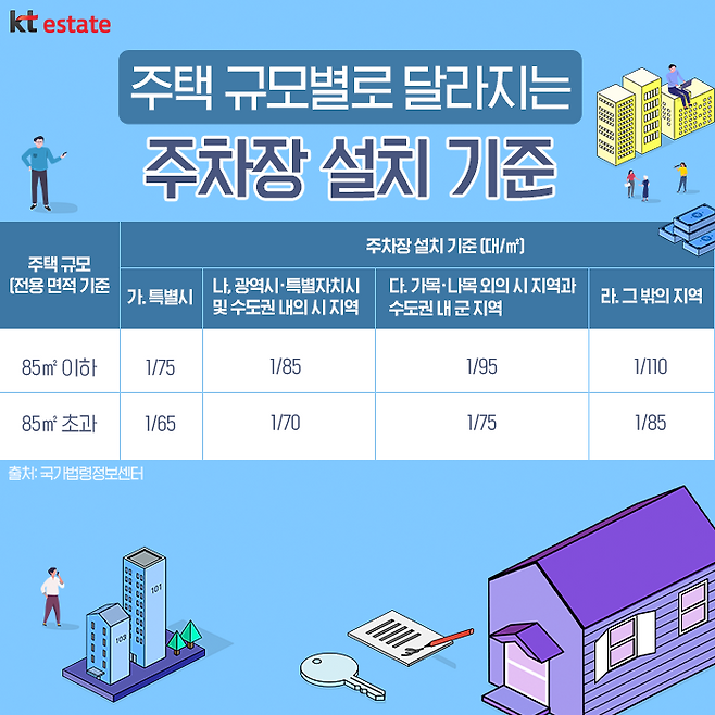 일례로 서울시 내 A 아파트가 전용 면적 101㎡ 100가구, B 아파트가 전용 59㎡ 100가구로 구성돼 있다고 가정해보겠습니다. 이 경우 A는 가구당 1.55대, B는 0.7대로 가구 수는 같아도 법정 주차 대수는 2배 이상 차이가 날 수밖에 없는 것이죠.