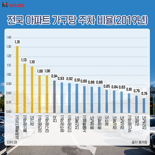 심지어 최근에는 2대 이상 보유한 가구들이 늘며 수많은 아파트에서 주차 대수 부족 현상을 겪고 있는데요. 통계청 ‘아파트 주거환경통계’ 중 지역별 주차장 시설현황에 따르면 2019년 기준으로 전국 아파트의 가구당 주차 비율은 1:0.94로 가구당 1대 미만인 것으로 나타났습니다. 서울은 0.89대였으며, 가장 낮은 곳은 전라남도로 0.76대였고, 가장 높은 곳은 세종시로 가구당 1.31대였습니다. 주로 수도권, 광역시일수록 가구당 주차 비율이 높았으며, 지방일수록 낮은 현상을 보였는데요.