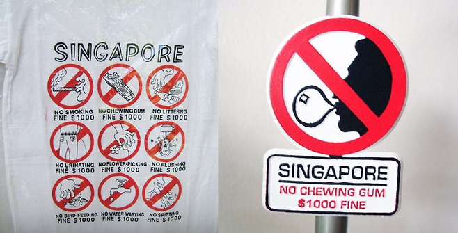 껌을 씹다가 함부로 버리게 되면 길거리가 껌 자국으로 지저분해진다는 이유로 껌 수입과 판매가 법으로 금지됐다고 하는데요. 껌을 씹다가 적발될 경우 쓰레기 투기와 같은 기준에 따라 1000SGD(약 80만원)을 물게 된다고 하네요.