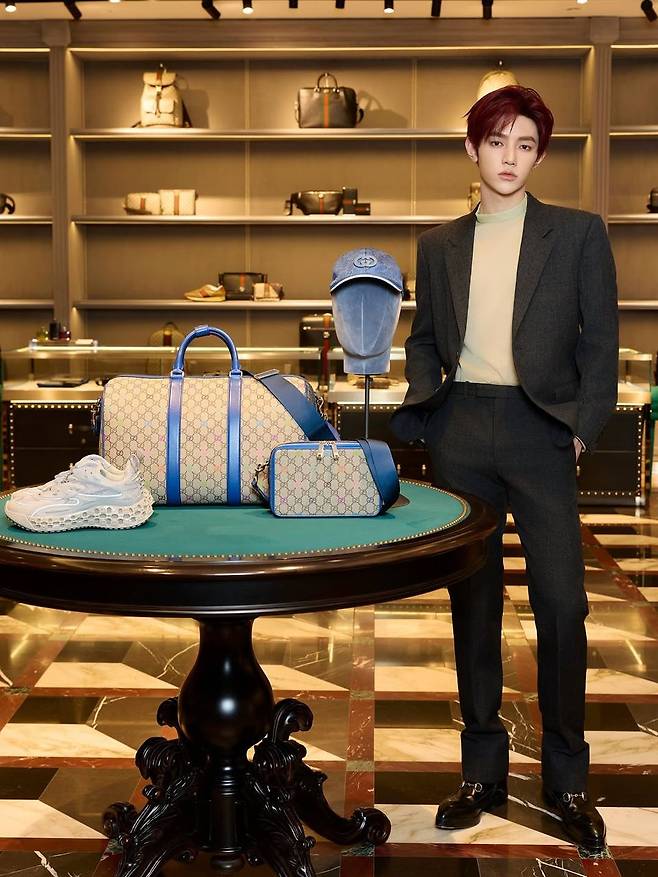 테이블 위에 함께 배치된 구찌의 GG 패턴 보스턴백과 미니 크로스백은 장하오의 포멀한 수트룩에 현대적인 감각을 더한다. 특히 블루 레더 디테일이 클래식한 모노그램 패턴과 조화를 이루며 시선을 사로잡는다. 여기에 청키한 러버 솔이 인상적인 스니커즈와 로고 디테일의 데님 캡까지 더해져, 남성적인 매력과 유니크한 캐주얼 감성이 공존하는 분위기를 연출했다.