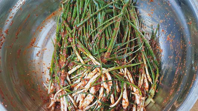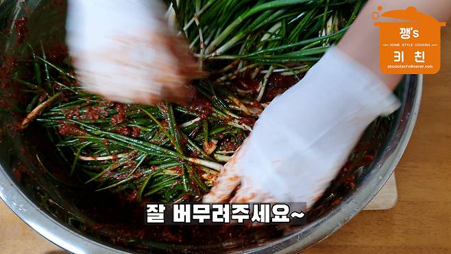 쪽파의 흰부분부터 줄기쪽으로 쓸 듯이 양념을 발라주세요