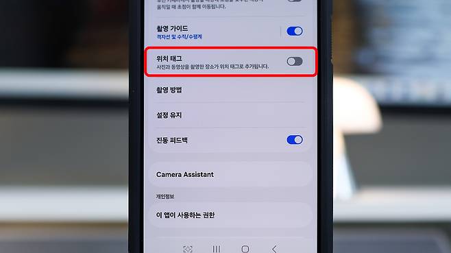 '위치 태그' 항목을 찾으면 파란 불이 켜져 있을 겁니다. 이게 켜져 있으면 사진에 장소가 저장되는 상태입니다. 한 번 눌러 회색으로 꺼주면 됩니다.