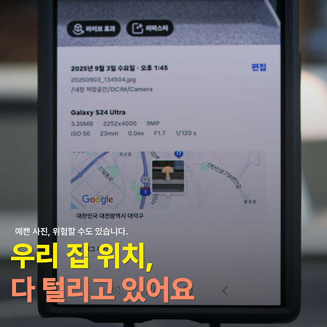 사진 찍는 일은 이제 우리 생활 속 작은 즐거움이 됐습니다. 꽃이 예쁘게 핀 길가에서도, 손주가 웃는 순간에도, 밥상 위에 맛있는 반찬이 올라왔을 때도 자연스럽게 휴대폰을 꺼내 사진을 찍습니다. 그런데 갤럭시 스마트폰을 쓰신다면 꼭 확인해야 할 게 있습니다. 바로 사진 속에 위치 정보가 자동으로 기록된다는 사실입니다.