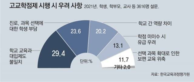 지난해 6월 한국교육과정평가원이 학생과 학부모, 교사 3616명을 대상으로 진행한 설문조사에서도 고교학점제 운영 시 가장 우려되는 점으로 ‘학교교육과 대입제도의 불일치’를 선택한 응답자가 29.4%로 가장 많았다. 임성호 종로학원하늘교육 대표는 “지금도 학생부종합전형이 불공정하다는 인식이 강한데 ‘고교학점제가 공정하다’고 학부모들이 받아들일지 미지수”라며 “커리큘럼이 더 좋은 특수목적고 쏠림 현상이 나타날 수도 있다”고 말했다.
