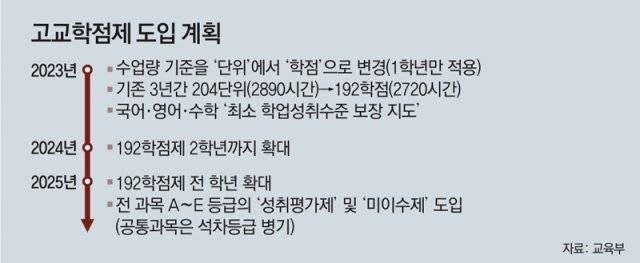 당장 내년부터 달라지는 부분도 있다. 내년 고교 신입생부터 수업량 기준이 ‘단위’에서 ‘학점’으로 바뀐다. 3년간 총 수업 시간은 현재 2890시간(204단위)에서 2720시간(192학점)으로 170시간 줄어든다. 공통과목인 국영수의 학업성취율이 40%에 못 미치면 보충수업을 받는 ‘최소 학업성취수준 보장 지도’를 해야 한다.