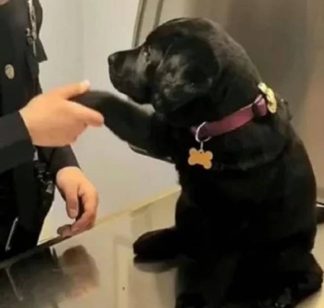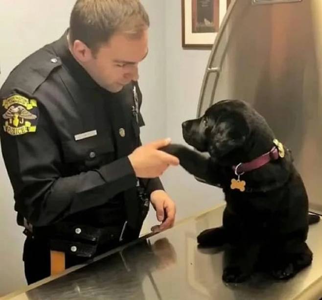 첫번째 사진 속에는 이제 갓 경찰서에 발을 들인 아기 블랙 래브라도 리트리버가 등장합니다. 솜사탕처럼 보드라운 털과 세상을 다 가진 듯 천진난만한 눈망울을 가진 이 강아지는 경찰관 아저씨와 손을 맞잡고 인사를 나눕니다.