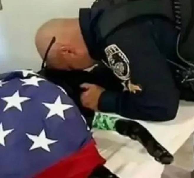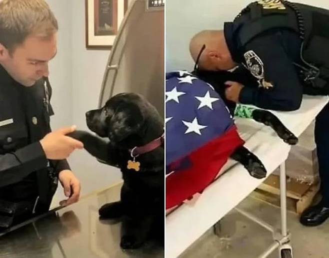 평생을 헌신한 영웅에게 경의를 표하기 위해 동료 경찰관들은 강아지의 몸 위에 국기를 정성스럽게 덮어주었습니다.