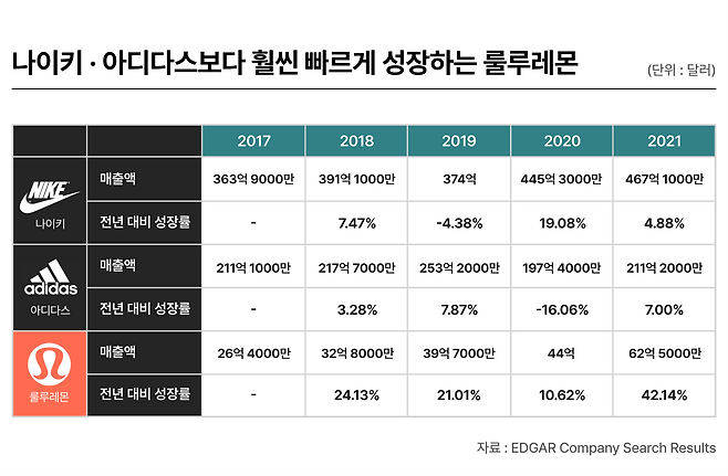 룰루레몬 시가총액이 아디다스보다 훨씬 높은 거 아셨나요? 22년 9월 21일 기준 룰루레몬 시총은 약 59조8494억원, 아디다스 시총보다 63.5%나 높아요. 글로벌 스포츠웨어 시장에선 나이키에 이은 시총 2위 기업이죠. 아직 체급 차이가 좀 나지만, 가장 강력한 ‘나이키 대항마’인 건 맞아요.