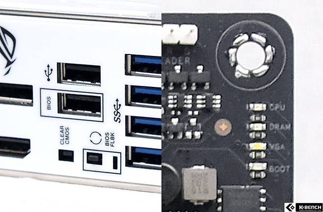 대신, STRIX는 앞서 설명한대로 막시무스 보다 기능 사용이 좀더 불편할 뿐이다. CLEAR CMOS나 바이오스 플래시백 버튼이 매우 작아 손으로 눌러서 사용하긴 어렵고 Q-LED 또한 특정 부품에 이상 유무만 색상으로 표기할 뿐 세부 코드를 보여주진 않는다.