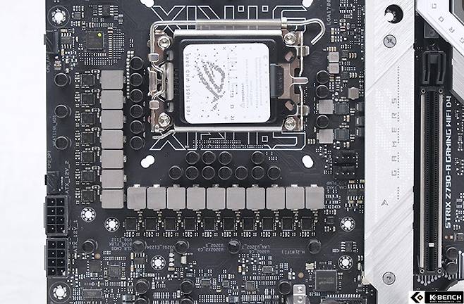 ASUS STRIX Z790-A Gaming WiFi D4는 막시무스 시리즈 만큼은 아니지만 채널당 70A를 소화하는 파워스테이지를 채택, 16+1 페이즈로 필요 이상의 출력을 감당하기에 충분한 회로를 구성했으며 ASUS만의 팀드 구조로 민감한 전력 변화에 보다 빠르게 대응할 수 있게 만들었다.