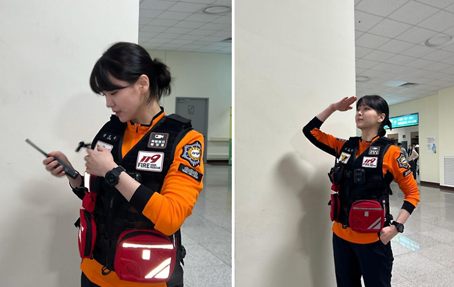 올블랙의 시계가 걸크러쉬 소방관다운 느낌을 더해주는 것 같은데요! 블랙 특유의 전문성이 돋보여 더 멋진 것 같죠!
