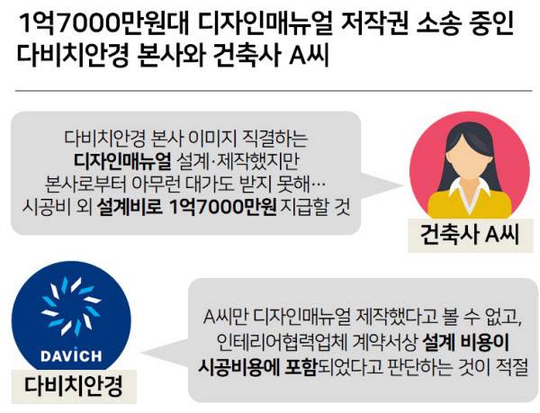 반면 다비치안경 본사 측은 디자인매뉴얼 저작권 침해를 내세우는 A씨의 주장에 동의할 수 없다는 입장을 고수하고 있다.