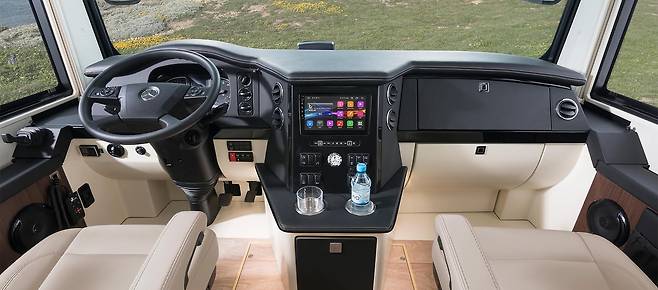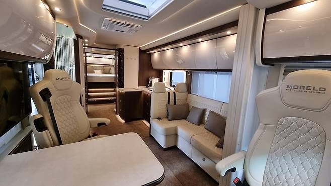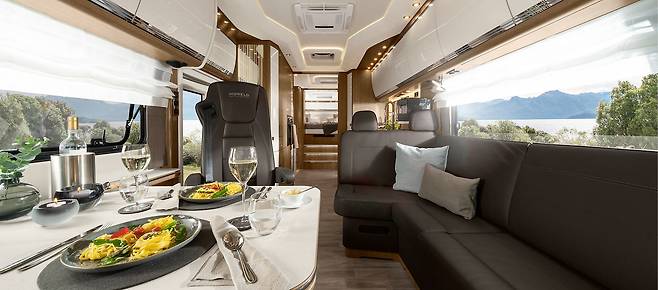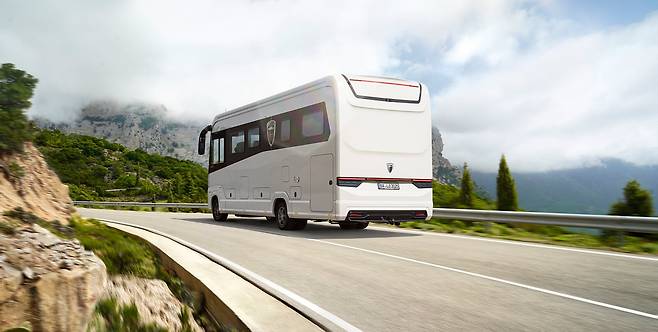차량 외부에는 조망용 대형 파노라마 창을 장착했고, 주차 시에는 전방위 카메라와 ‘버드뷰’ 시스템을 활용해 조작 편의성을 높였다. 슬라이드 아웃 구조 없이도 넓은 실내 공간이 확보돼 주차 후 별다른 설치 과정 없이 곧바로 생활이 가능하다. 가전 외에도 전동 어닝, 전기 자전거 탑재 공간 등이 있어 장기 체류용으로도 손색이 없다.