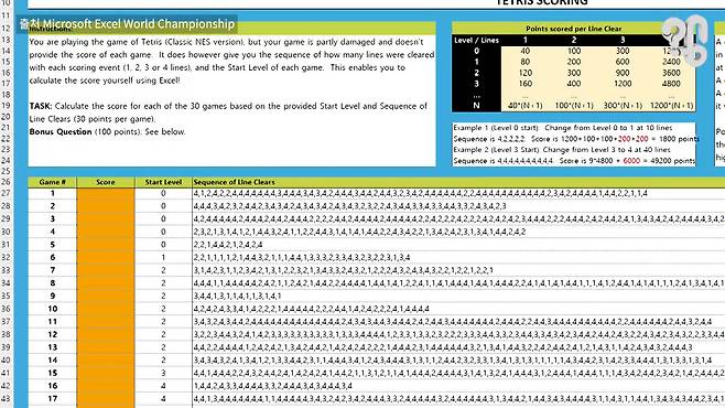 근데 도대체 어떤 문제가 나올까. 이건 2021년 대회 16강전 문제인데, 요약하면 주어진 데이터를 가지고 테트리스 게임의 점수 계산 방식대로 엑셀 수식을 사용해 수많은 결과값을 30분 안에 최대한 맞게 산출해야 한다.