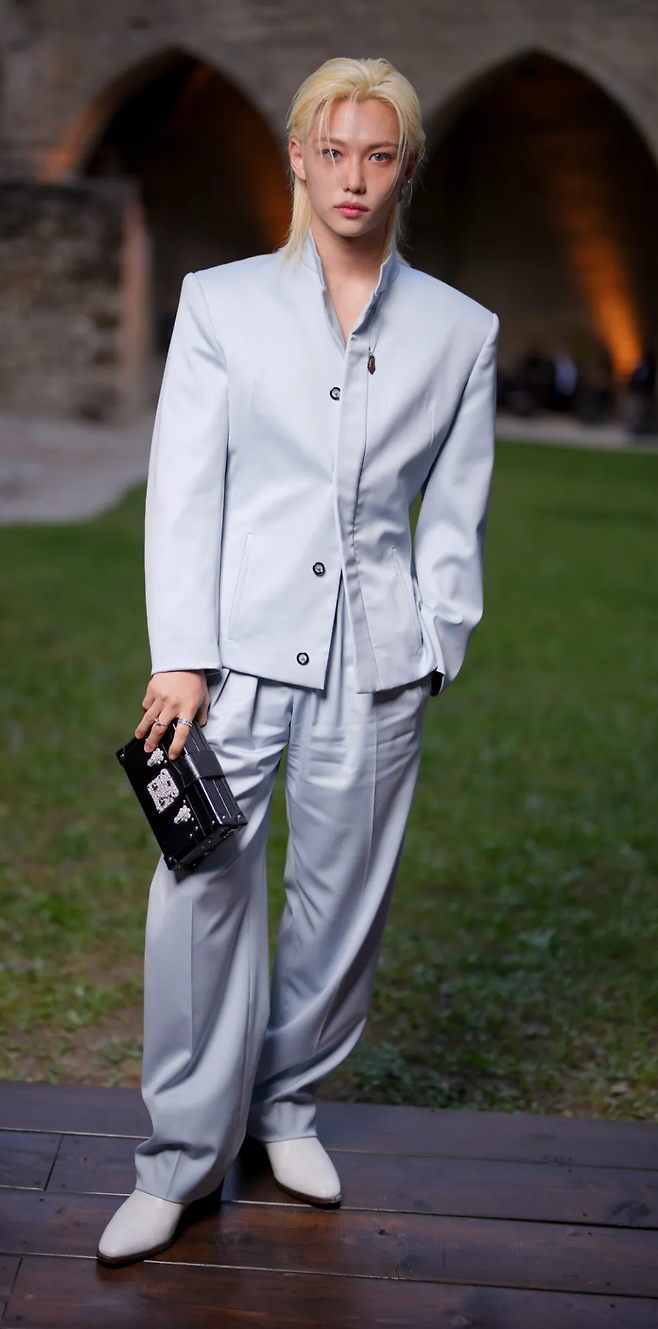 이날 필릭스는 파우더 블루 테일러드 슈트와 블랙 클러치 백, 실버 주얼리를 매치한 소프트한 수트룩으로 등장, K탑 스타의 강렬한 존재감을 발산했다.