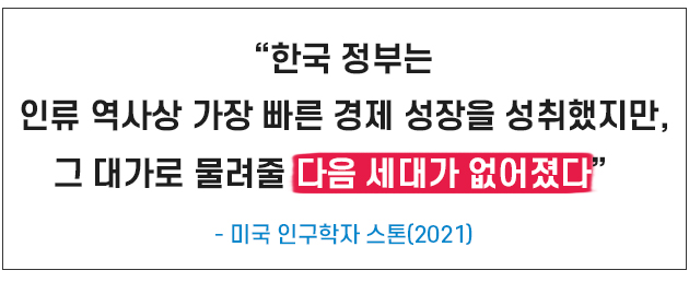 = 합계출산율 0.7이라는 게 얼마나 말도 안 되는 수치냐면, 여성이 100명 있어요. 그러면 아이를 몇 명 낳을까요? 100명이 있으면 70명이죠. 그다음 세대가 30년 정도 지나서 다음 세대 아이를 몇 명을 낳을까요? 70명에 0.7을 곱하면 한 50명 될 거라고 생각하시죠?
