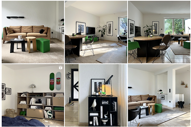 레퍼런스는 앞서 정한 키 컬러와 미드 센추리 모던을 키워드로 핀터레스트와 인스타그램에서 찾았어요. 초록색 가구가 있는 사진을 찾아보며 초록색과 조합된 다른 컬러의 가구들을 눈여겨보았습니다.