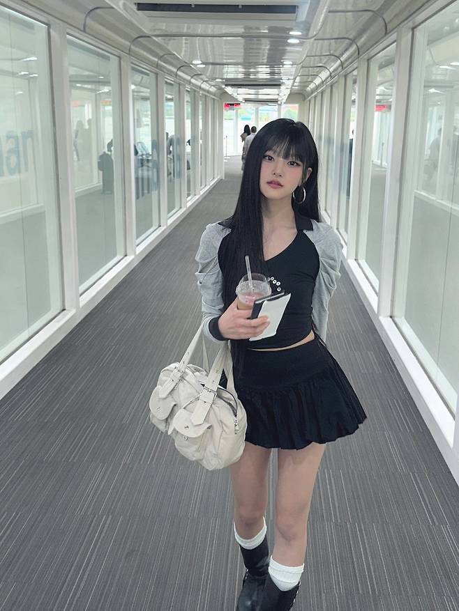 하늘의 룩 포인트는 블랙 크롭티다. 브이 네크라인이 은근하게 클레비지 라인을 드러내고, 슬림 핏 실루엣이 허리를 매끈하게 정리한다. 그 위에 그레이 볼레로 카디건을 살짝 걸쳐 냉방 대비와 레이어드 포인트를 동시에 챙겼다. 하의는 셔링 디테일의 A라인 미니스커트로, 걸을 때마다 리듬감 있는 플레어가 연출돼 경쾌한 분위기를 만든다. 화이트 리브 삭스와 블랙 라운드 토 부츠의 조합은 다리 라인을 더욱 길어 보이게 하고 안정적인 무드를 준다. 아이보리 호보백과 볼드 후프 이어링이 스타일에 ‘한 방’을 더하며 공항룩의 완성도를 높였다.