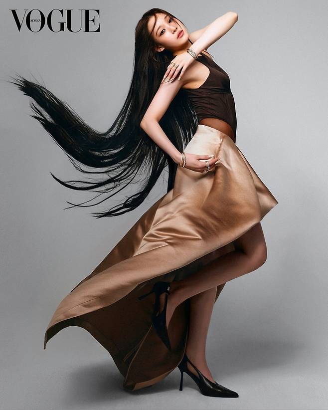 실크 소재의 홀터넥 드레스와 화려한 주얼리를 매치한 커버 컷에서는 고전적인 아름다움을, 강렬한 레드 드레스와 역동적인 포즈의 전신 컷에서는 아티스트로서의 에너지를 가감 없이 드러냈다.