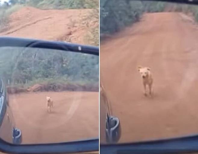 사이드미러 속에는 "도와주세요"라는 눈빛을 한 갈색 강아지가 온 힘을 다해 차량 뒤를 따라 달리고 있는 것이 아니겠습니까.