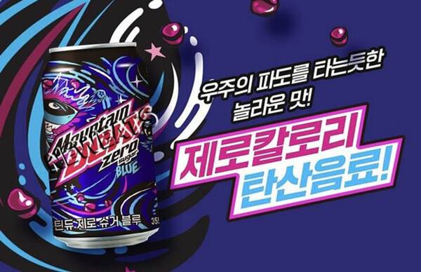 롯데칠성음료는 마운틴듀를 제로 음료로 선보였다. ‘마운틴듀 제로슈거 블루’가 바로 그것으로, ‘우주의 파도를 타는 듯한 놀라운 맛’이 콘셉트다. 기존 제품에서 당류를 빼고 마운틴듀 특유의 짜릿한 맛은 살렸다. 기존 마운틴듀 기준으로는 355㎖ 기준 172㎉로, 당류는 약 43g이 함유돼 있었다. 이미 미국, 유럽 등지에서는 제로 칼로리 음료로 판매되고 있는 제품이다. 355㎖ 캔 제품 기준 편의점 판매가는 1,700원이다.