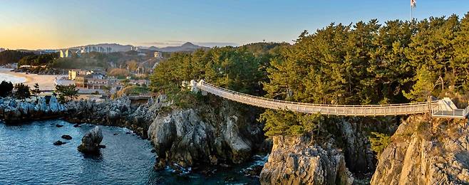 강원 동해시 추암해변에는 바다 위를 가로지르는 특별한 산책로인 '추암 촛대바위 출렁다리'가 놓여 있다. 2019년 6월에 조성된 이 출렁다리는 길이 약 72m로 동해 바다 위에 직접 지어진 해상 출렁다리다.