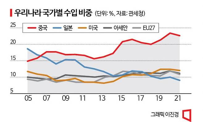 이처럼 대중국 무역수지가 계속 악화하는 것은 수출은 줄어드는 반면, 수입 의존도는 더 커지고 있기 때문이다. 우리나라는 부존자원이 부족해 주요 원자재·자본재의 수입비중이 높은데 그중에서도 특히 중국에 대한 의존도가 심하다. 중국이 단순조립·가공 역할에서 중간재 제조강국으로 전환하기 시작하면서 우리 수입공급망이 중국에 집중된 결과다. 중국은 제조기술을 점차 고도화하는 가운데 희토류, 리튬, 코발트 등 광물자원 확보를 크게 늘렸고, 현재 원자재·반도체·화공품 등의 품목에서 우리나라에 가지는 영향력이 상당하다.
