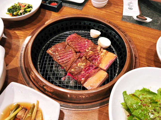고깃집에서 고소한 냄새와 함께 구워지는 불판 위 고기,