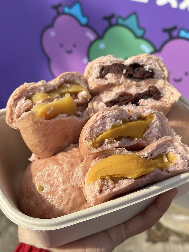 포도찐빵은 포도즙으로 만들어 빵이 보랏빛을 띄어요. 빵 자체도 부드러워서 입에 넣으면 살살 녹는 기분이 들어요. 필링은 팥, 단호박, 군고구마가 있어 취향에 맞게 골라 드시면 된답니다.