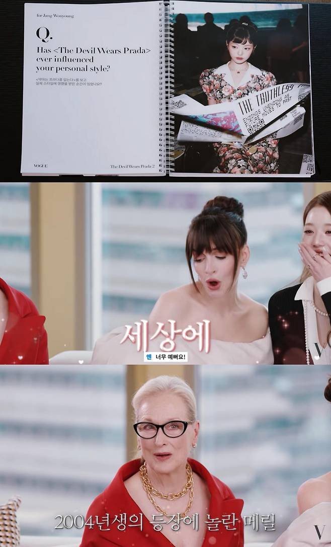 메릴 스트립과 앤 해서웨이는 '악마는 프라다를 입는다' 시즌1이 2006년에 개봉했다며 2004년생이라는 장원영의 발언에 놀라기도 해 웃음을 안겼다.