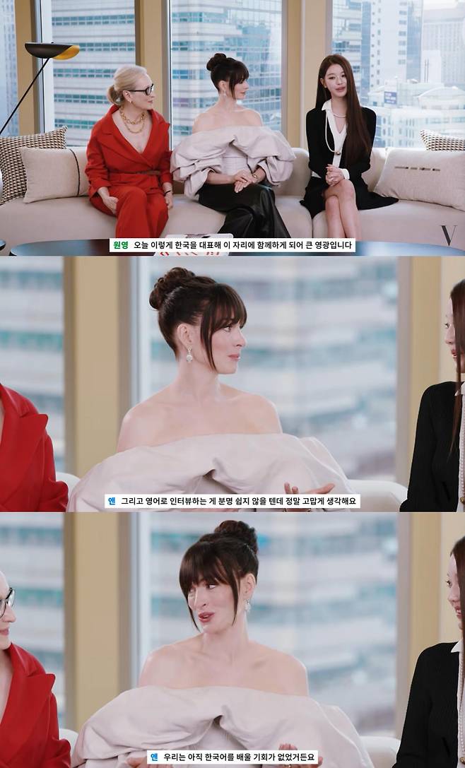 장원영의 미모를 칭찬한 앤 해서웨이는 "영어로 인터뷰하는 게 어려울텐데 정말 감사하다. 우린 아직 한국어를 배울 기회가 없었다"며 애정을 표했다.
