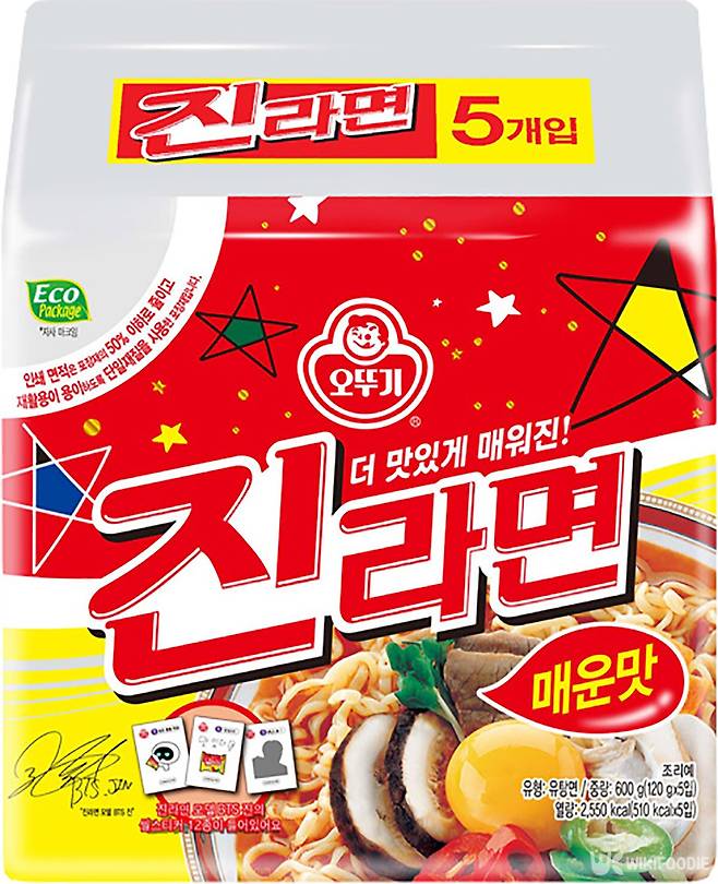 오뚜기의 ‘진라면’은 1988년 출시 이후 꾸준히 사랑받고 있다. ‘진라면’의 ‘진’은 한자 ‘眞(참 진)’을 써서 ‘참된 라면’ 또는 ‘진한 국물’이라는 뜻을 담았다.