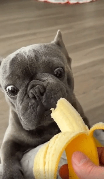 주인이 바나나를 내밀자 조심스럽게 냄새를 맡고 한입 베어문 강아지—처음의 낯설음 속 작은 용기