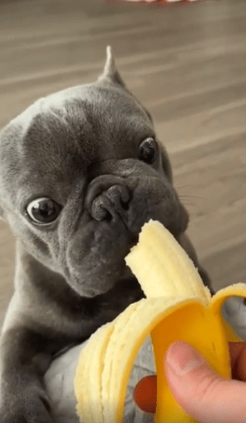 주인이 바나나를 내밀자 조심스럽게 냄새를 맡고 한입 베어문 강아지—처음의 낯설음 속 작은 용기