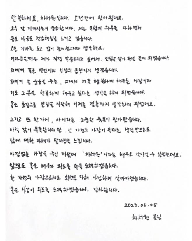 당시 군 복무 중이던 차서원은 팬카페에 자필 편지를 올려 “늘 웃음을 주는 사람과 평생을 함께하고 싶다는 생각이 들었다”며 결혼을 직접 알렸다.