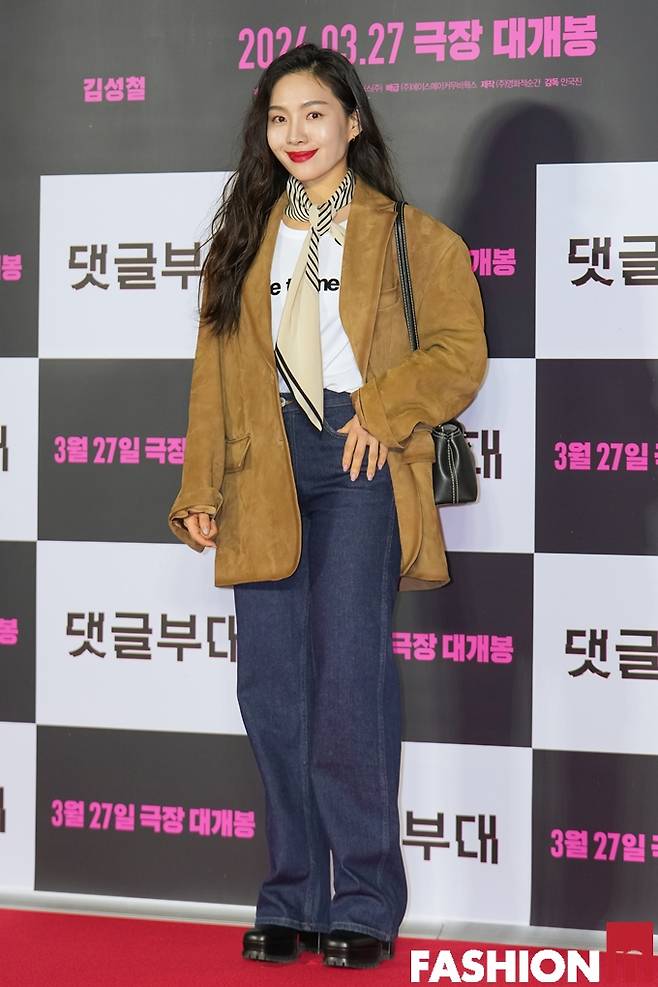 이날 최희서는 예쁜 미소의 레드립에 스카프 타이를 매고 데님 팬츠와 화이트 티셔츠에 스웨이드 재킷을 매치한 캐주얼 슈트룩으로 댄디한 여성미를 완성했다.