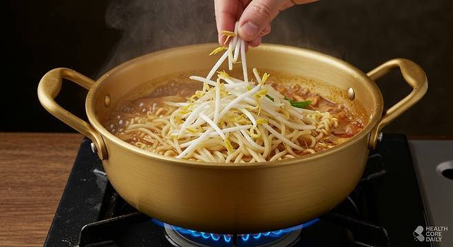 콩나물은 라면과 의외로 궁합이 잘 맞는다. 아삭한 식감이 국물의 무거움을 덜어주고, 고소한 맛은 라면의 짠맛을 눌러준다. 콩나물 속 아스파라긴산은 숙취 해소 성분으로 알려져 있다. 라면을 아침 해장 음식으로 먹는 이들에게는 특히 유용한 조합이다.