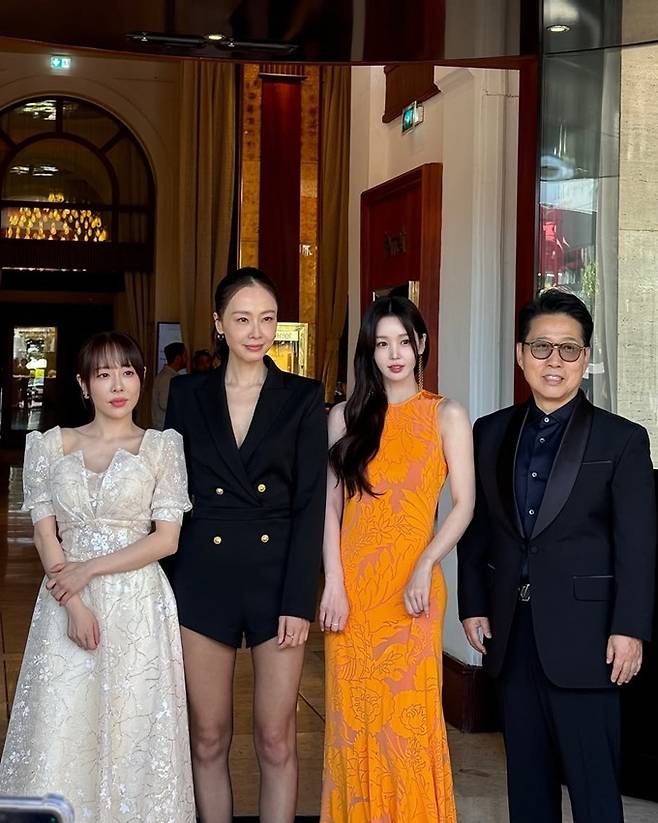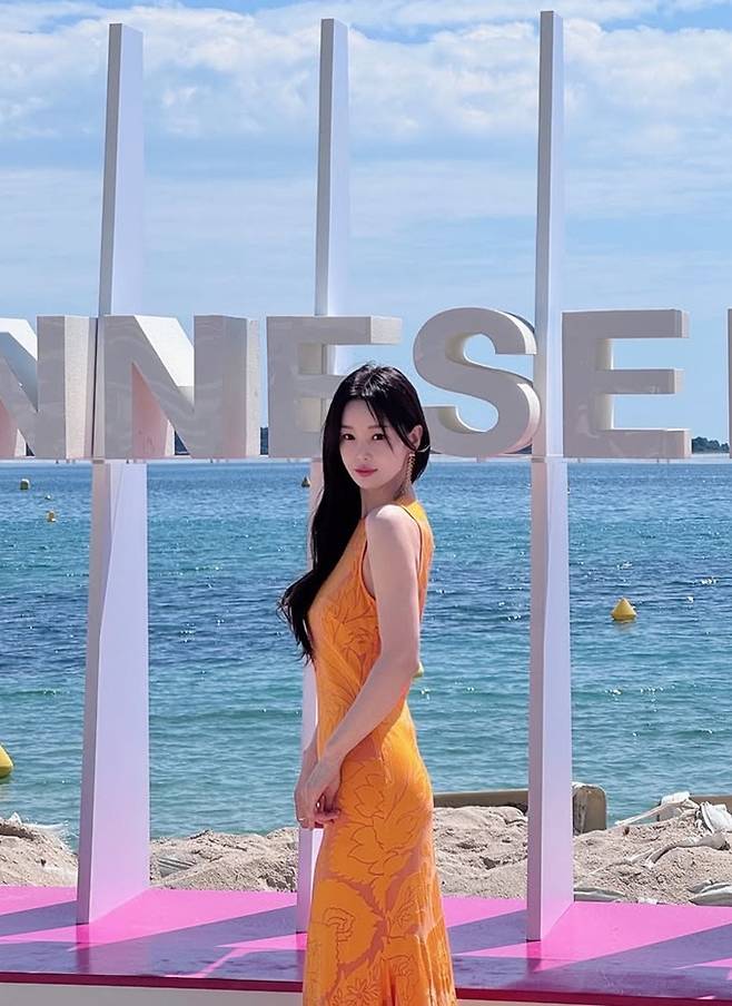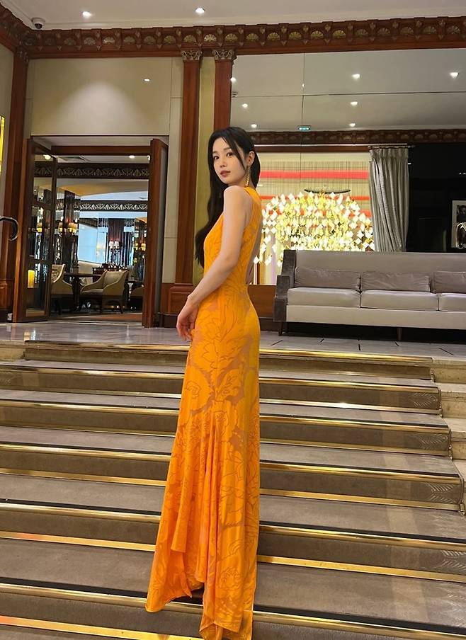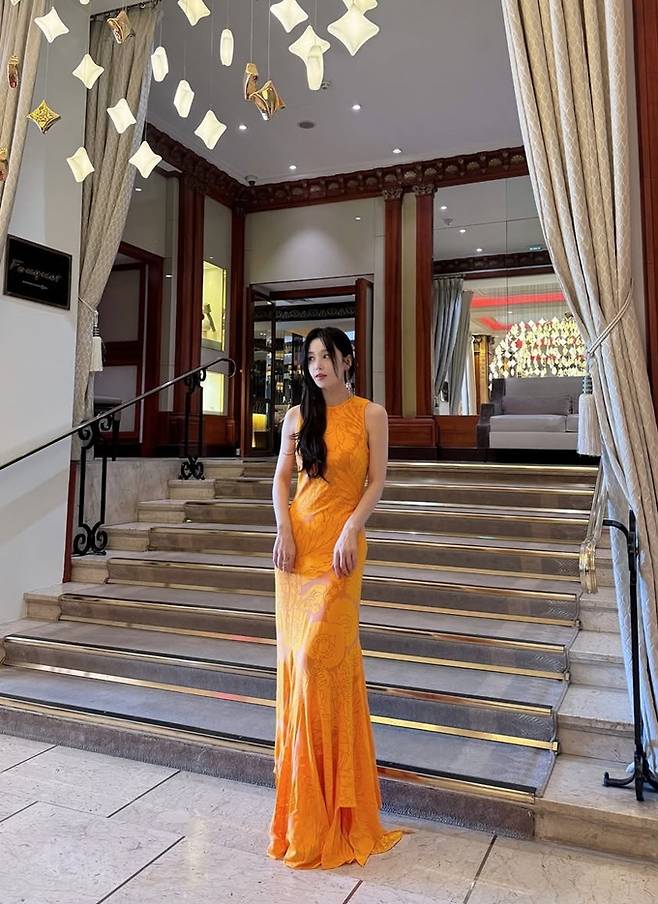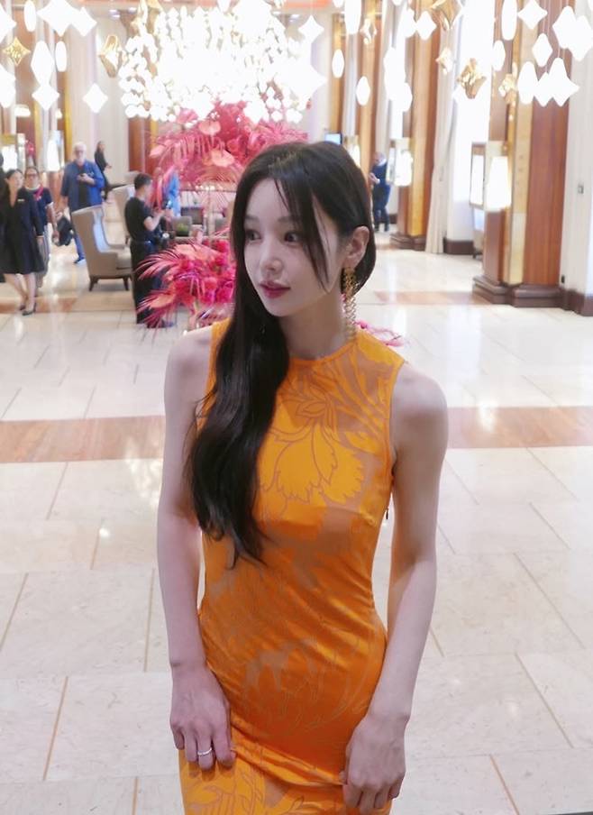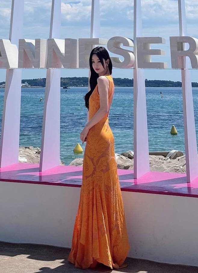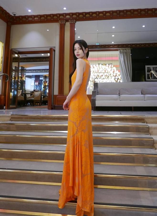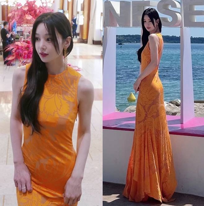 그룹 씨야 출신의 배우 남규리가 칸 영화제에서 오렌지 민소매 드레스룩으로 비율 좋은여신 핏을 뽐냈다.