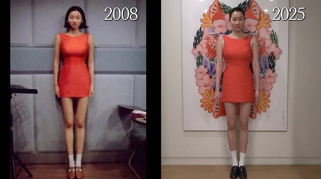 드레스를 입은 장윤주는 17년 전 사진과 거의 똑같은 몸매를 유지해 놀라움을 자아냈다. 하지만 그는 “뒤에 지퍼가 다 안 잠기긴 한다”고 솔직하게 현재의 체형 상태를 털어놨다. 장윤주는 흉곽 부위를 만지면서 “횡격막(가슴과 배를 나누는 근육)이 조금 커진 것 같다”고 말했다.