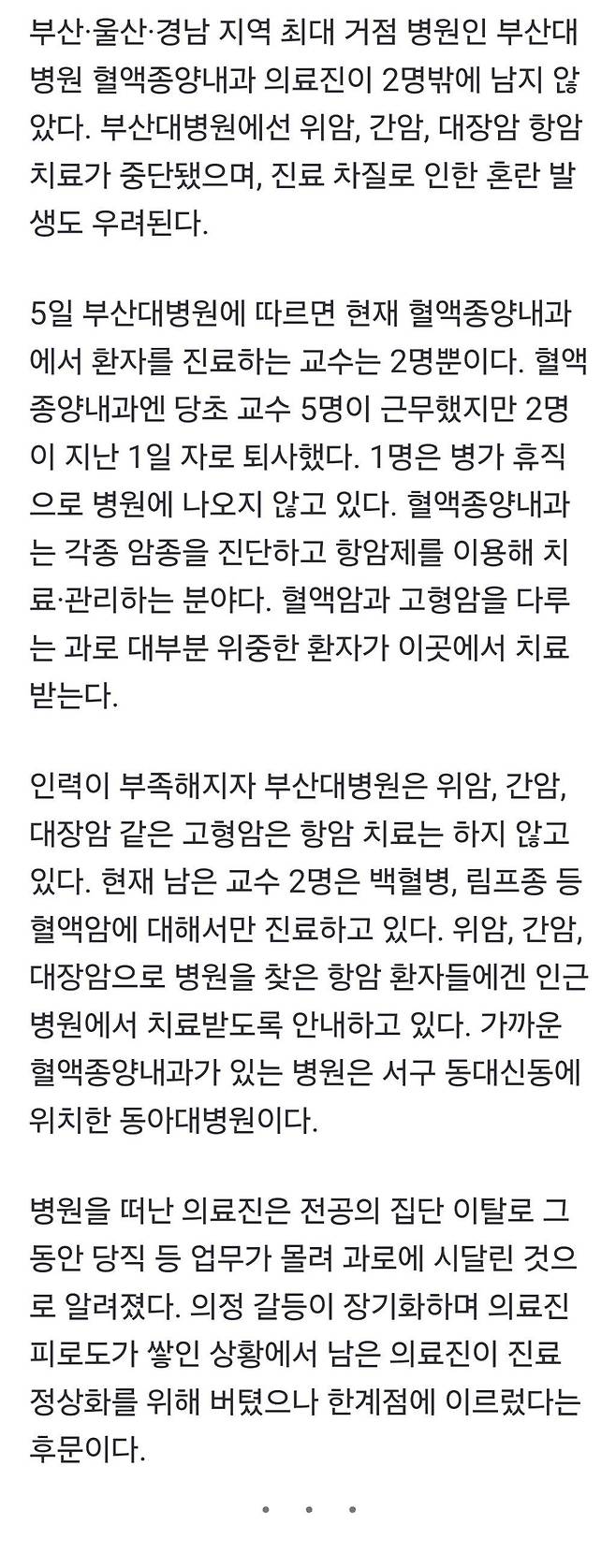부산·울산·경남 지역 최대 거점 병원인 부산대병원 혈액종양내과 의료진이 2명밖에 남지 않았다. 부산대병원에선 위암, 간암, 대장암 항암 치료가 중단됐으며, 진료 차질로 인한 혼란 발생도