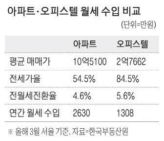 국토부가 비아파트부터 기업형 장기임대주택 도입을 검토하는 것은 아파트가 매매가격 대비 전세가가 낮아 기업의 임대주택 참여를 유도하기 쉽지 않기 때문이다. 한국부동산원에 따르면 지난달 서울 아파트 평균 매매가격 대비 전세가는 54.4%다. 즉 서울 아파트 평균 매매가격이 10억원이라면 전세가는 5억4000만원 선이라는 뜻이다. 여기에 서울 아파트 전월세전환율 4.6%를 적용하면 가구당 연간 2500만원 남짓을 월세 수익으로 가져갈 수 있다. 반면 서울 오피스텔은 매매가격 대비 전세가 비율이 84.47%다. 서울 오피스텔 전월세전환율이 5.6%이니, 매매가격이 10억원이라면 연간 4700만원의 월세 수익을 가져가게 된다. 물론 오피스텔 매매가격은 아파트보다 낮아 실제 월세 수입은 줄어들지만 비아파트가 아파트에 비해 임대 수익을 내기가 용이한 셈이다.