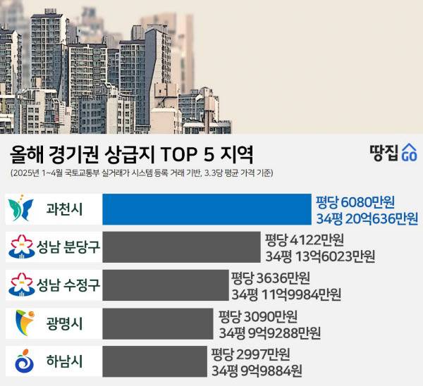땅집고가 올해 실거래된 가격을 기준으로 경기권 지역 순위를 매긴 결과, 이른바 ‘준(準) 강남’으로 불리는 과천시가 압도적인 1위를 차지한 것으로 나타났다. 이어 성남·광명·하남시가 5위까지 나란히 등장했다.