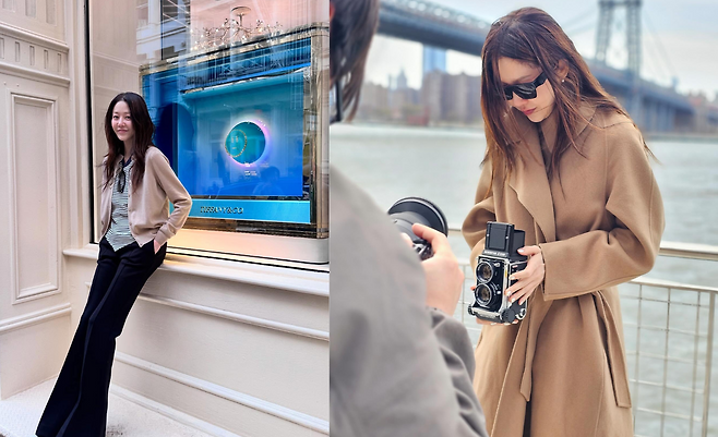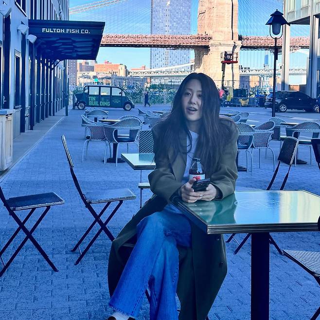 고현정은 브루클린 브리지를 배경으로 롱 카키 코트와 와이드 데님 팬츠, 화이트 티셔츠를 매치해 도회적이면서도 편안한 분위기를 연출하고 있다. 내추럴하게 풀어진 헤어와 손에 든 음료, 그리고 여유로운 표정이 뉴욕의 자유로운 감성을 더한다.
