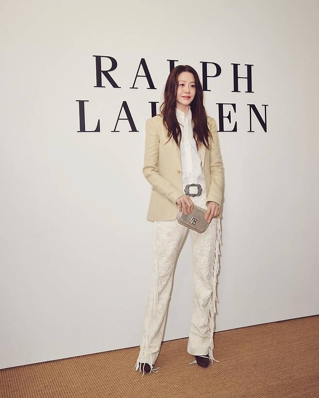 랄프 로렌 로고 앞에서는 아이보리 컬러의 재킷과 화이트 셔츠, 자수 디테일이 돋보이는 팬츠로 고급스러운 클래식 룩을 선보였다. 벨트와 클러치로 포인트를 주며, 전체적으로 절제된 우아함과 세련미가 강조된다.