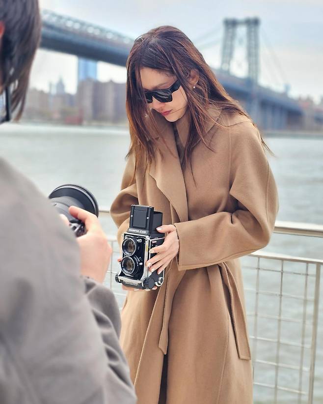 강가에서는 오버사이즈 카멜 코트와 블랙 선글라스를 착용해 시크한 무드를 연출했다. 빈티지 카메라를 들고 있는 모습이 예술적 감각을 더하며, 전체적으로 고현정 특유의 도시적이고 세련된 이미지를 부각시킨다.