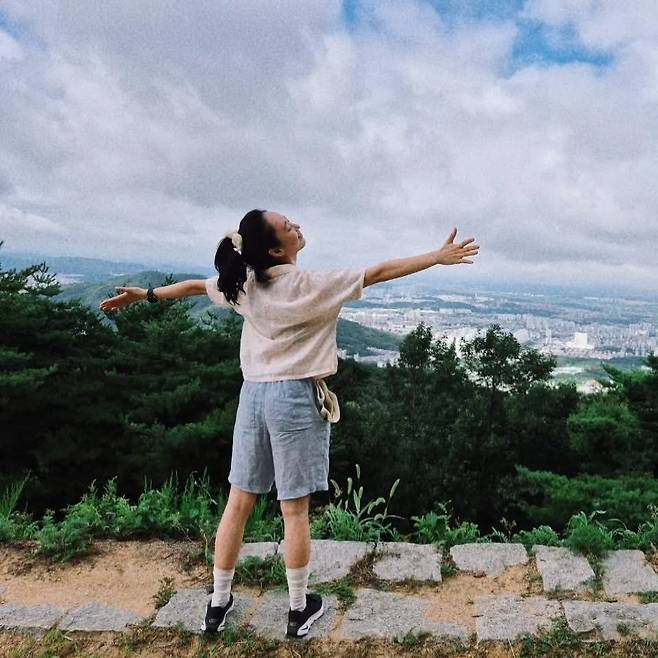 첫 번째 사진에서는 산 정상에서 자연과 어우러진 자유로운 룩을 보여준다. 크림색 반팔 셔츠와 연청 반바지를 매치해 산뜻한 이미지를 완성했다. 발목까지 올라오는 양말과 운동화는 활동성을 강조하며, 헤어밴드로 머리를 묶어 깔끔함을 더했다. 자연과 조화를 이루는 편안한 스타일이 인상적이다.